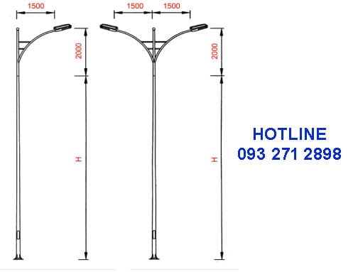 Chiều cao: Từ 8 – 16m tính cả đế và thân. Cần đèn có chiều dài linh hoạt từ 1,12m – 1,25m.