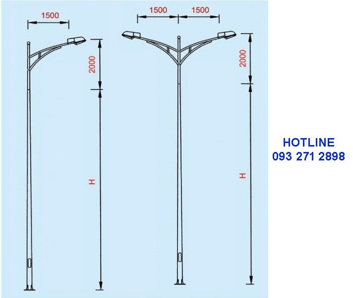 Chiều cao: Từ 8 – 16m tính cả đế và thân; cần đèn có chiều dài 1,12m – 1,25m tùy loại.