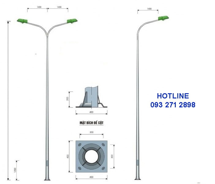 Chiều cao: Từ 8 – 16m (bao gồm thân và đế cột). Cần đèn cao từ 1,12m – 1,25m tùy loại.