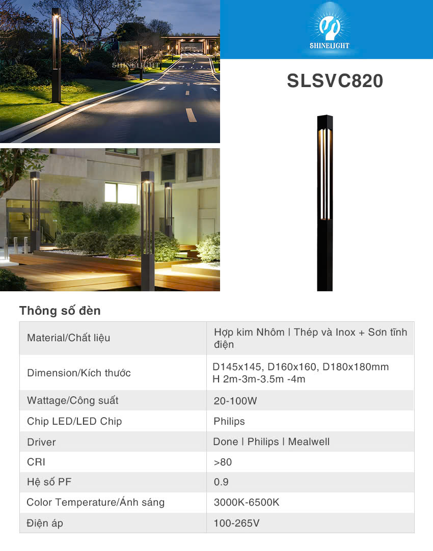 Cột đèn LED SLSVC820 không chỉ là lựa chọn lý tưởng cho sân vườn hiện đại mà còn phù hợp cho nhiều không gian khác nhau như công viên, khuôn viên nhà hàng, hoặc khu vực thương mại. Sự linh hoạt trong thiết kế và hiệu suất cao của sản phẩm này giúp nó phát huy tối đa vai trò của mình ở mọi nơi.