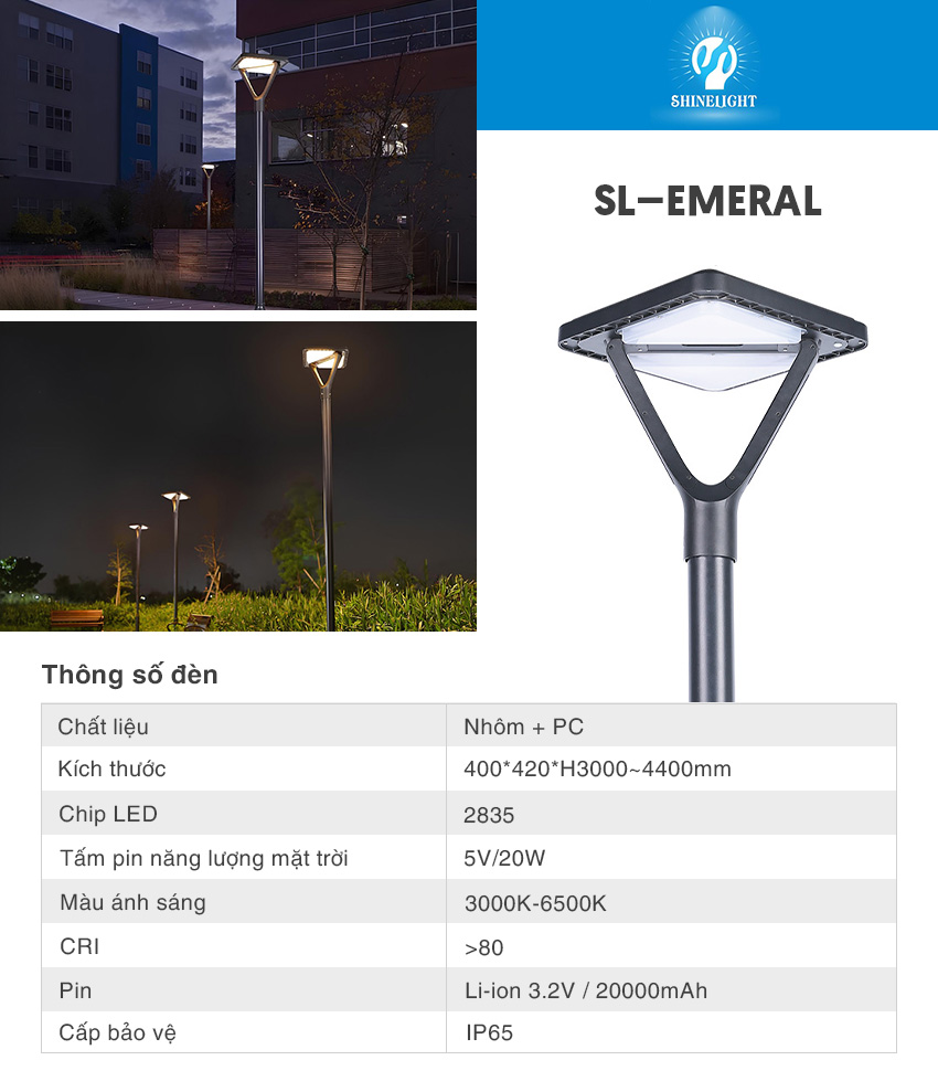 Đèn năng lượng mặt trời SL – EMERAL là loại đèn được sử dụng tấm pin MONO và lắp trên cột thép hoặc cột nhôm có chiều cao từ 3m-4.4m , với thiết kế hình vuông và có nhiều chi tiết dập khuôn mang dáng vẻ hiện đại, đèn năng lượng mặt trời được sử dụng tấm pin Mono loại pin cao cấp cho thời lượng sạc pin nhanh hơn các loại pin thông thường, và có thời gian sáng lâu hơn với các loại pin khác. Đèn NLMT SL – EMERAL không chỉ làm không gian đẹp hơn vào ban ngày, mà nó làm cho khu cảnh quan của bạn sang trọng hơn khi về đêm.