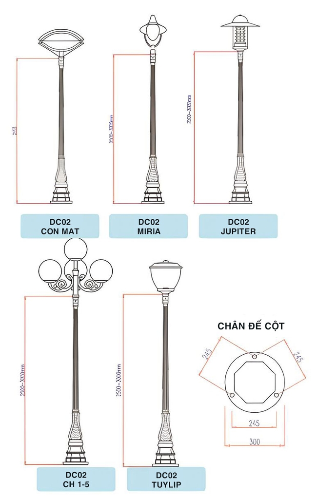 - Chất liệu: đế được làm bằng gang đúc đảm bảo độ vững chắc do thời thiết gây ra, thân cột được làm bằng nhôm đúc hoặc nhôm đùn áp lực cao.