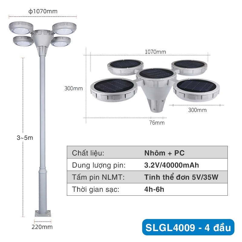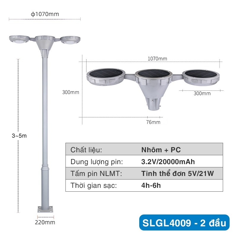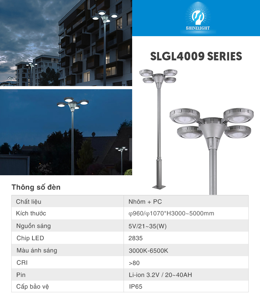 - Cột đèn sân vườn năng lượng mặt trời SLGL4009 series là dòng đèn NLMT cao cấp, sử dụng năng lượng mặt trời để phát sáng thông qua cơ chế chuyển hóa năng lượng từ ánh sáng mặt trời thành điện năng.