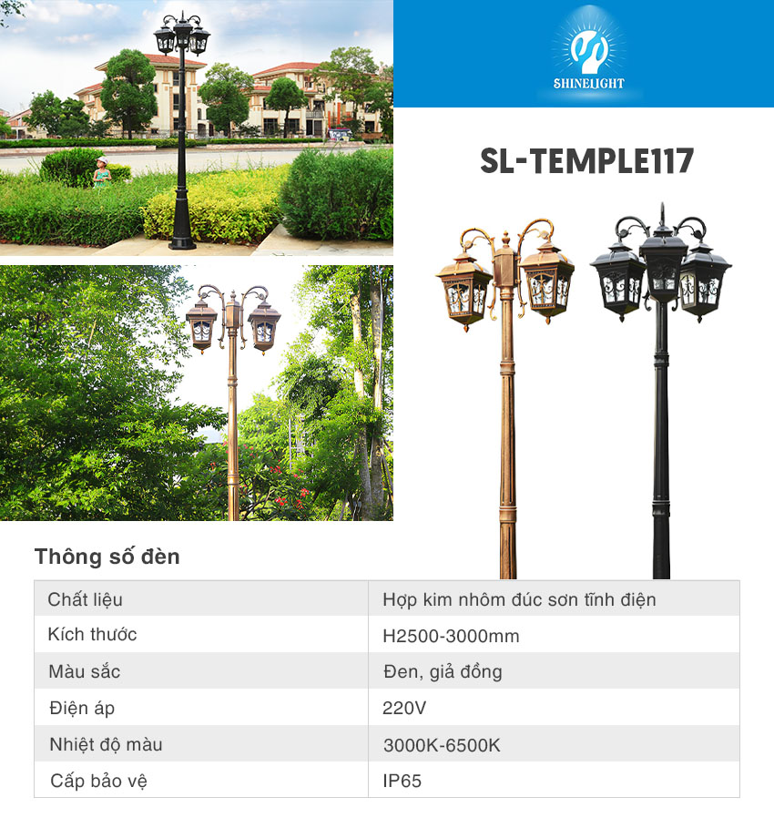 Là một loại cột đèn trang trí, mang hình dáng tân cổ pha lẫn chút hiện đại, phù hợp lắp đặt ở công viên, khuôn viên gia đình nhỏ, nơi thờ tự... Với chất liệu được làm bằng nhôm đúc phủ một lớp sơn tĩnh điện, mang lại độ bền theo thời gian với khí hậu khắc nhiệt ở VN.