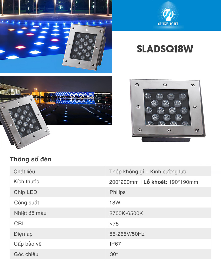 Đèn âm đất nói chung hay Đèn âm đất vuông SLADSQ18W nói riêng là loại đèn LED âm sàn, có thiết kế thân hình hình vuông dùng để chôn dưới mặt đất.