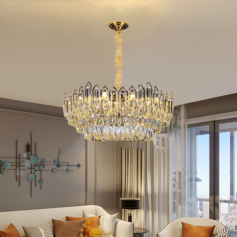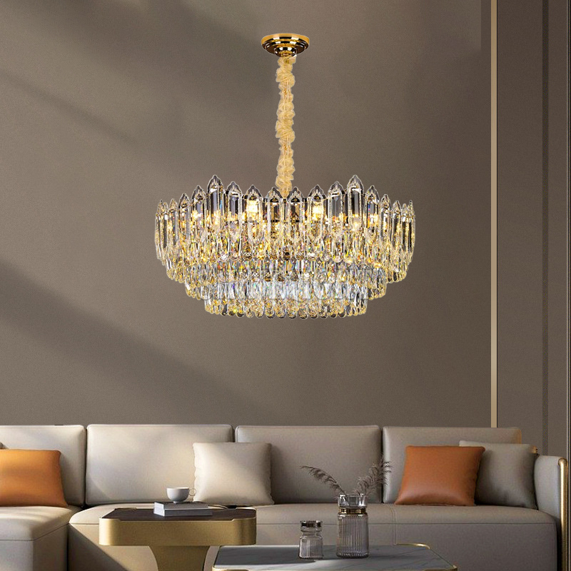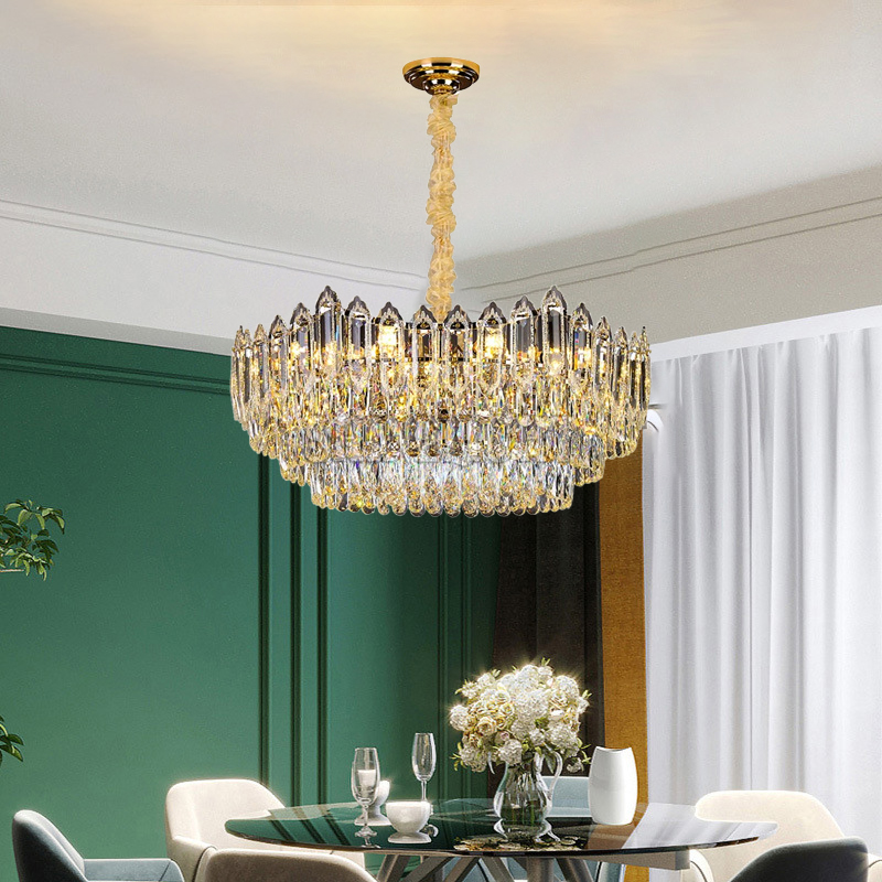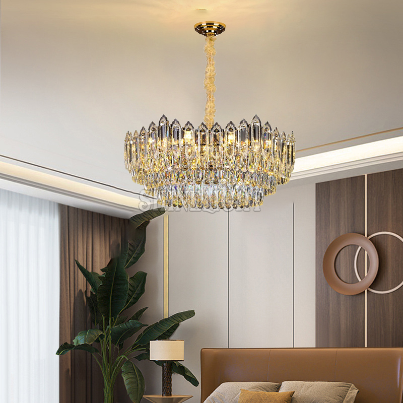 Khung đèn được chế tác từ hợp kim mạ PVD — công nghệ mạ tiên tiến giúp bề mặt sáng bóng, chống gỉ sét và bền màu tối ưu. Các chi tiết pha lê K9 được gia công cẩn thận, bề mặt trong suốt, cắt gọt tinh xảo, khúc xạ ánh sáng đa hướng, tạo ra hiệu ứng lấp lánh rực rỡ khi đèn sáng.