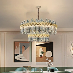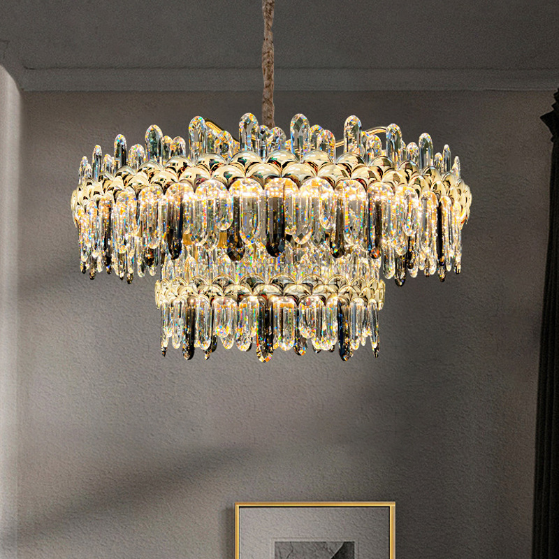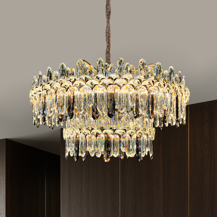 Khung đèn được chế tác từ hợp kim mạ PVD — công nghệ mạ tiên tiến giúp bề mặt sáng bóng, chống gỉ sét và bền màu tối ưu. Các chi tiết pha lê K9 được gia công cẩn thận, bề mặt trong suốt, cắt gọt tinh xảo, khúc xạ ánh sáng đa hướng, tạo ra hiệu ứng lấp lánh rực rỡ khi đèn sáng.