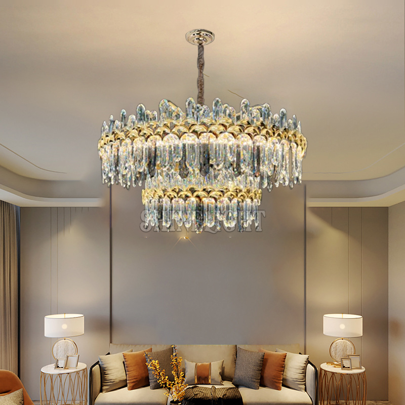 Đèn sở hữu 2 kích thước D750mm + D450mm, được xếp lớp khéo léo, tạo hiệu ứng phân tầng ấn tượng. Mỗi tầng đèn như một vòng ánh sáng sang trọng, góp phần mang lại cảm giác bề thế, xa hoa mà vẫn thanh thoát, không bị nặng nề.