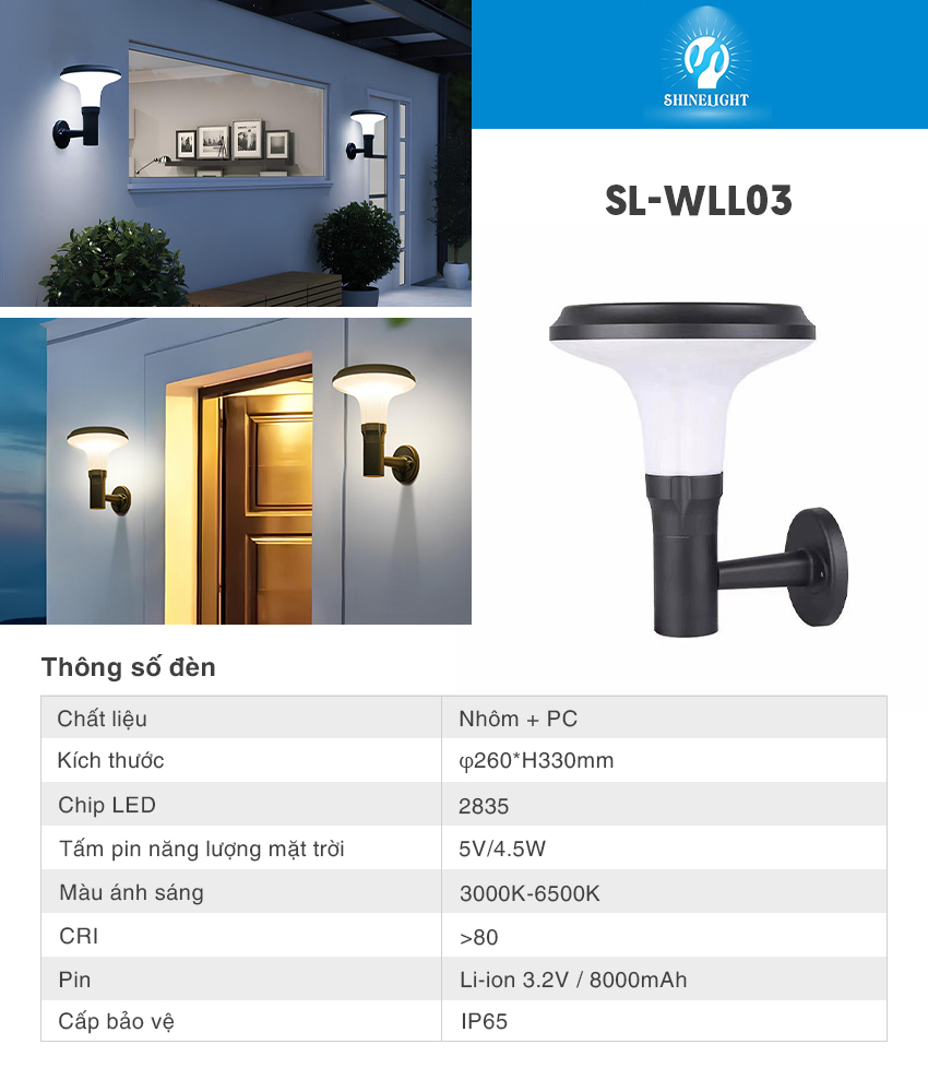 - Đèn ngắn tường năng lượng mặt trời SL-WLL03 là dòng đèn NLMT cao cấp, sử dụng năng lượng mặt trời để phát sáng thông qua cơ chế chuyển hóa năng lượng từ ánh sáng mặt trời thành điện năng.