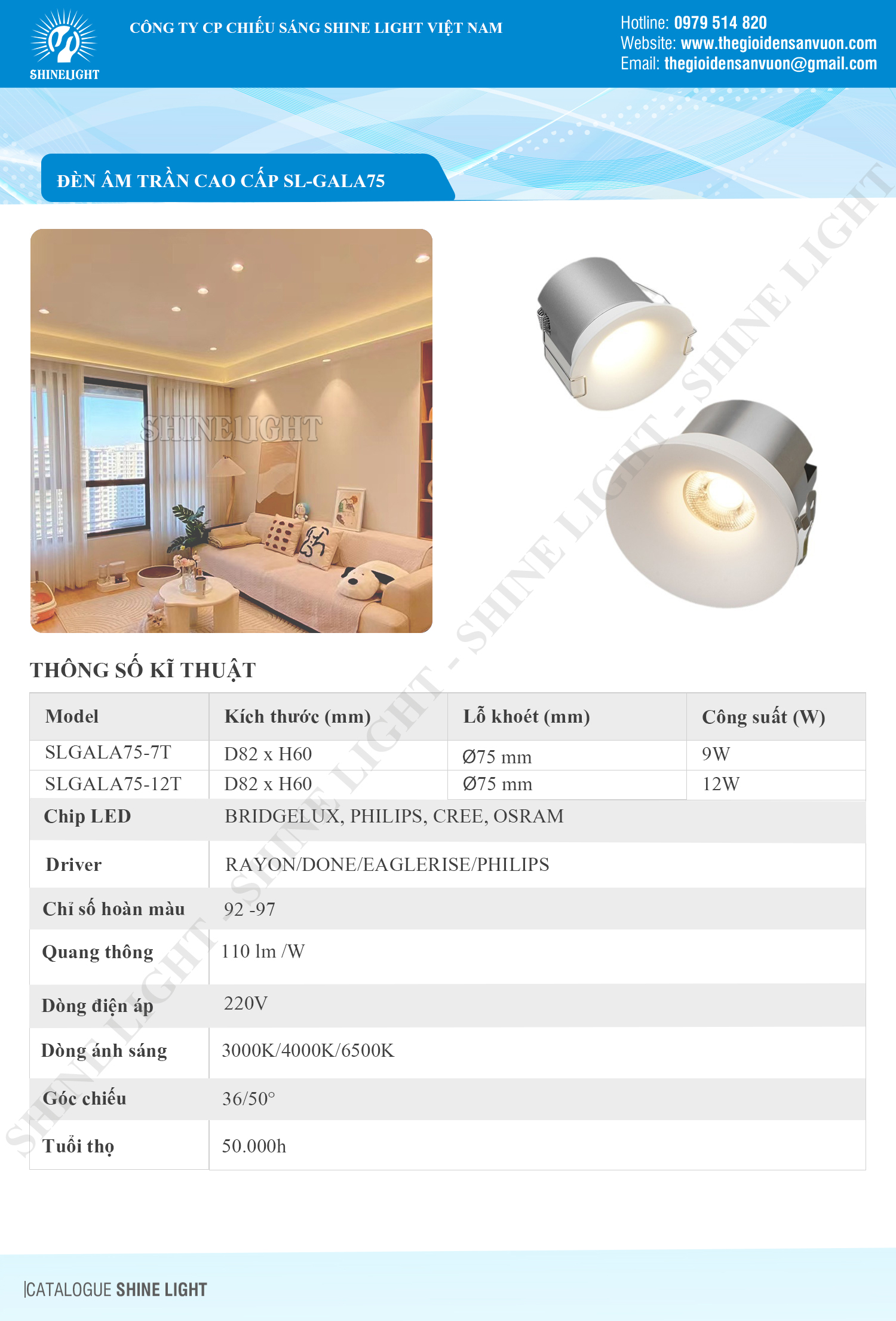 - Công suất: 7W (GALA75-7T) và 12W (GALA75-12T)