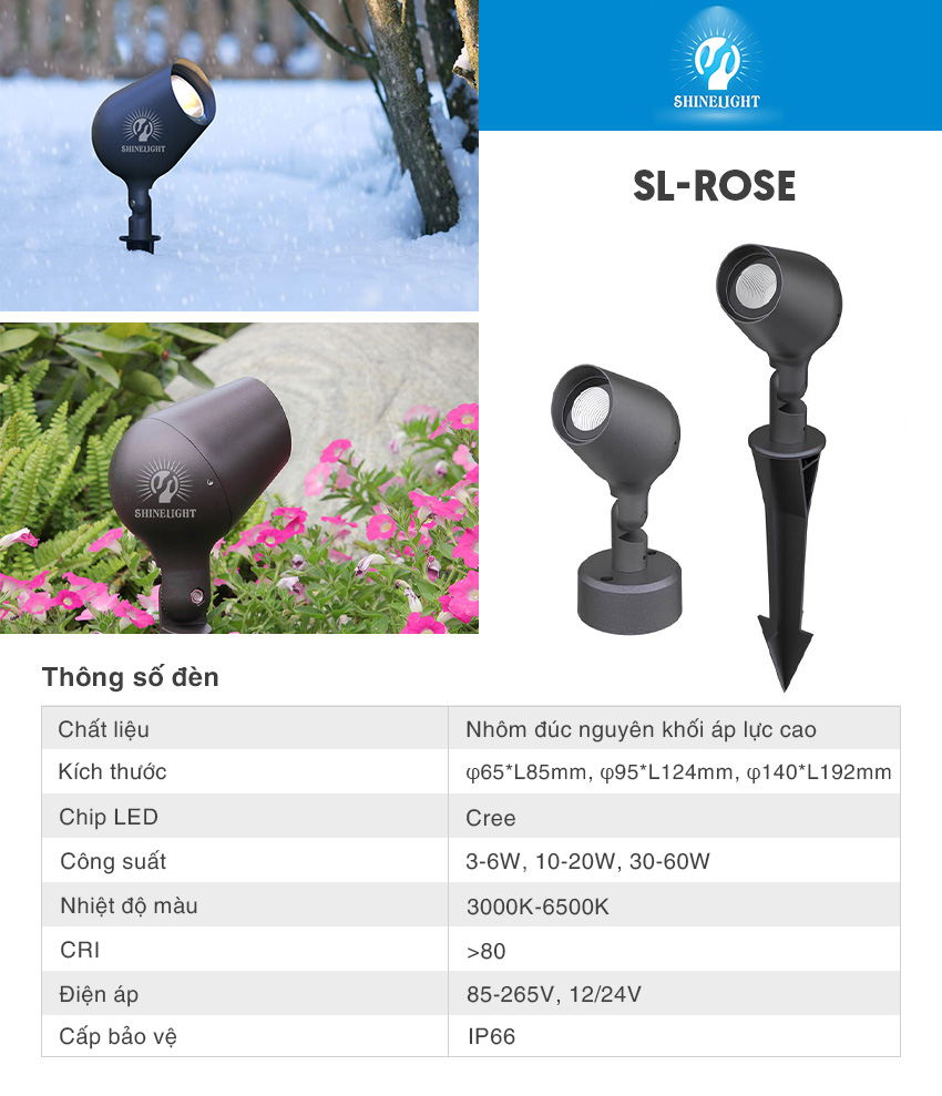 - Đèn rọi cây SL-ROSE Series lắp đặt bộ điện áp trực tiếp 220V thông dụng hoặc điện áp 12V/24V phổ biến hiện nay.