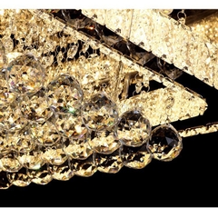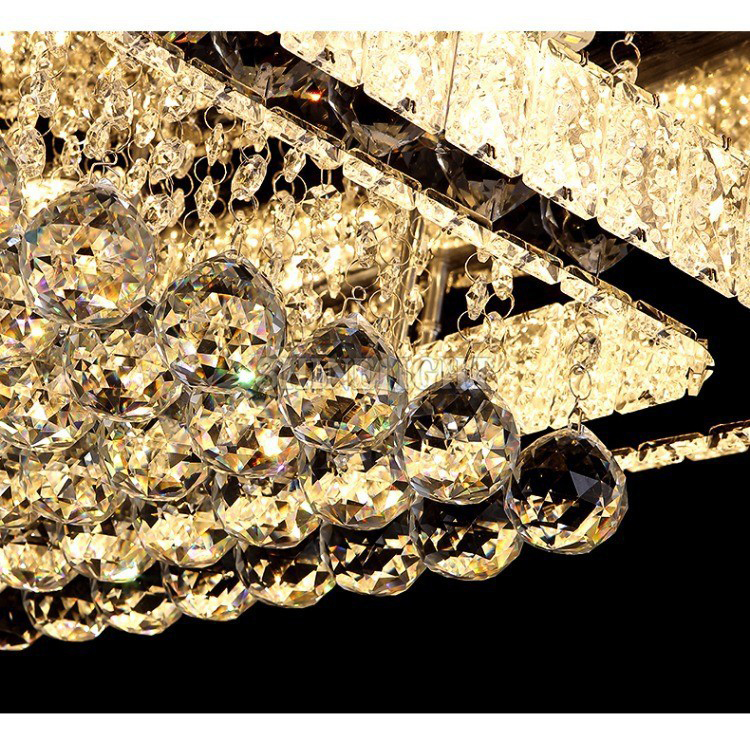 Mâm Pha Lê 792 gây ấn tượng ngay từ cái nhìn đầu tiên nhờ kiểu dáng hình chữ nhật hiện đại, thanh thoát nhưng đầy uy quyền. Các đường nét được chăm chút tỉ mỉ, kết hợp hài hòa giữa sự cứng cáp của khung kim loại và vẻ mềm mại, lấp lánh của những chuỗi pha lê được bố trí tinh xảo. Không gian sống như được nâng tầm đẳng cấp chỉ với một chi tiết duy nhất – chiếc đèn trần đầy nghệ thuật.