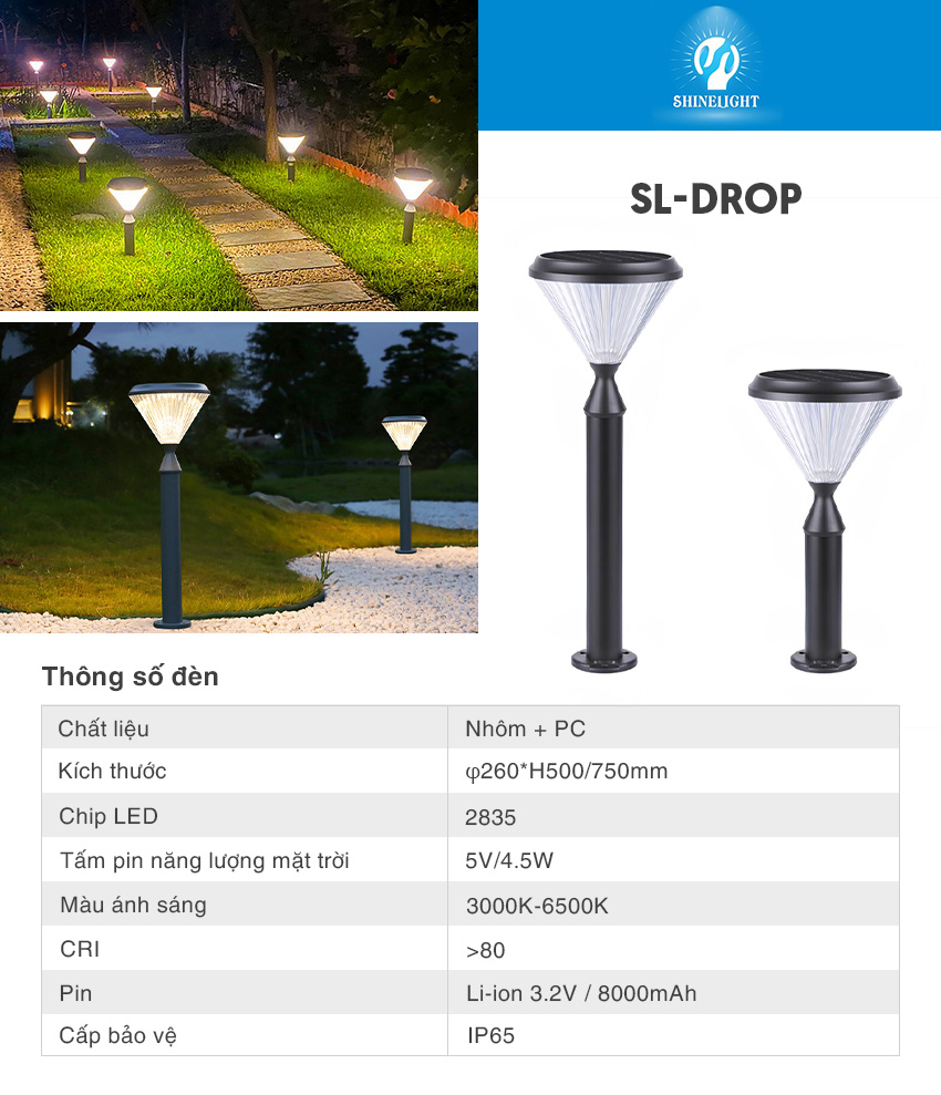 - Đèn nấm sân vườn năng lượng mặt trời SL-DROP là dòng đèn NLMT cao cấp, sử dụng năng lượng mặt trời để phát sáng thông qua cơ chế chuyển hóa năng lượng từ ánh sáng mặt trời thành điện năng.