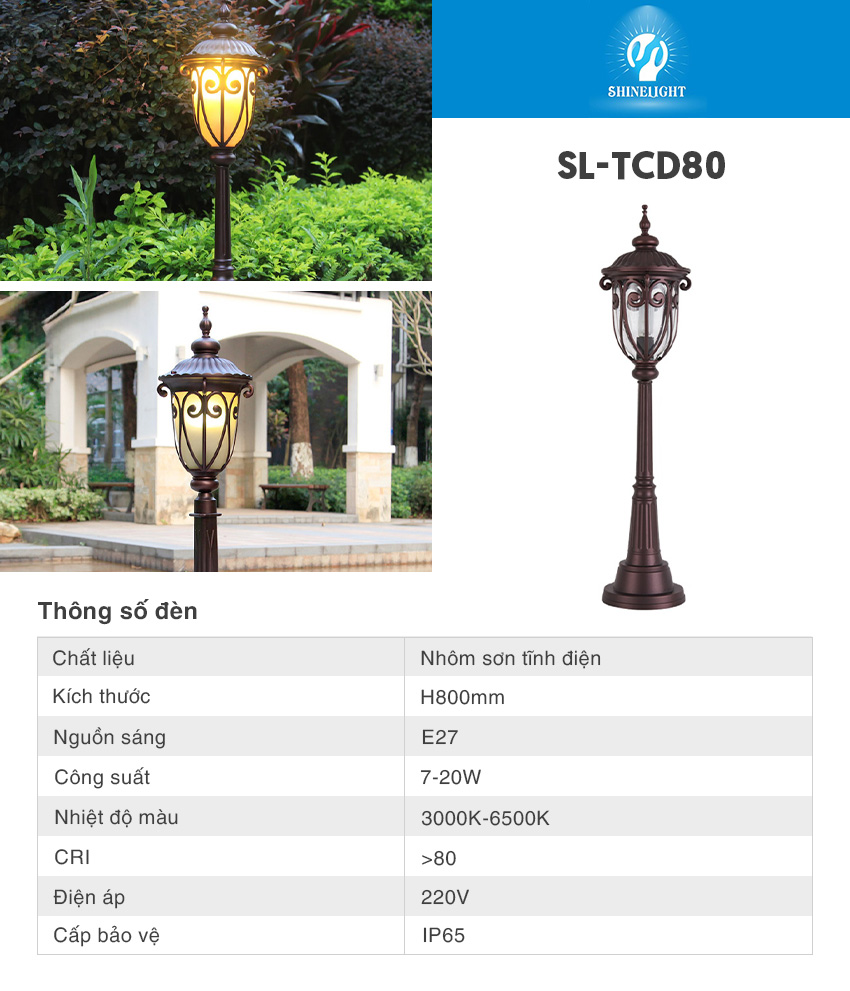 SL-TCD80 với thiết kế dạng cong vòm, sẽ làm cho khuôn viên mới thêm tính cổ điển, sang trọng và tinh tế. Kết hợp với chip led mang lại ánh sáng trung thực, độ bền cao cùng nhiều chi tiết đẹp mắt và cấp bảo vệ chống bụi, chống nước IP65 mang lại độ bền cao