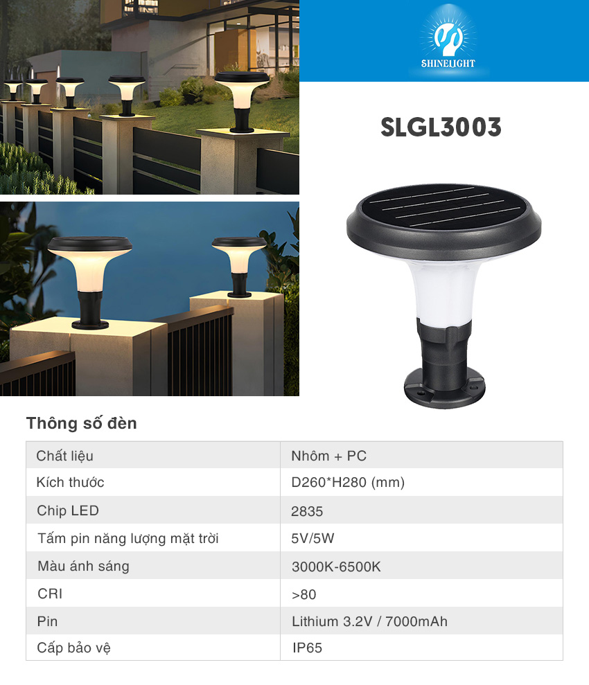 - Đèn trụ cổng năng lượng mặt trời SLGL3003 là dòng đèn NLMT cao cấp, sử dụng năng lượng mặt trời để phát sáng thông qua cơ chế chuyển hóa năng lượng từ ánh sáng mặt trời thành điện năng.
