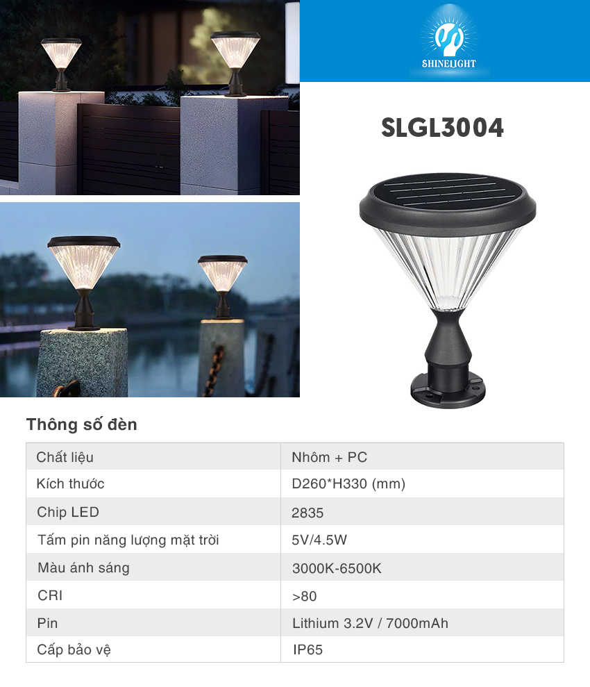 - Đèn trụ cổng năng lượng mặt trời SLGL3004 là dòng đèn NLMT cao cấp, sử dụng năng lượng mặt trời để phát sáng thông qua cơ chế chuyển hóa năng lượng từ ánh sáng mặt trời thành điện năng.